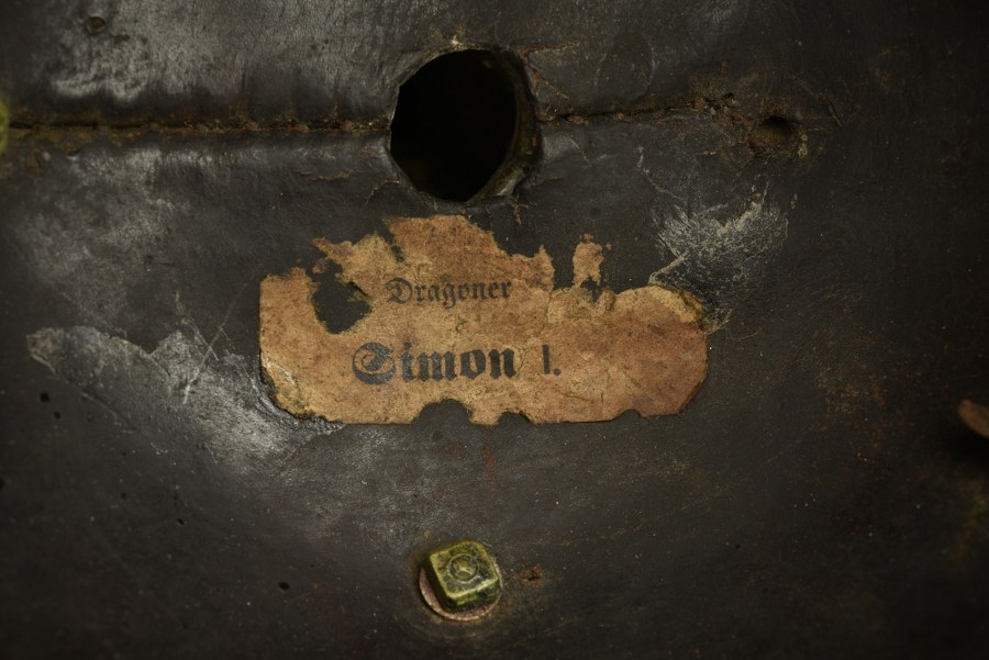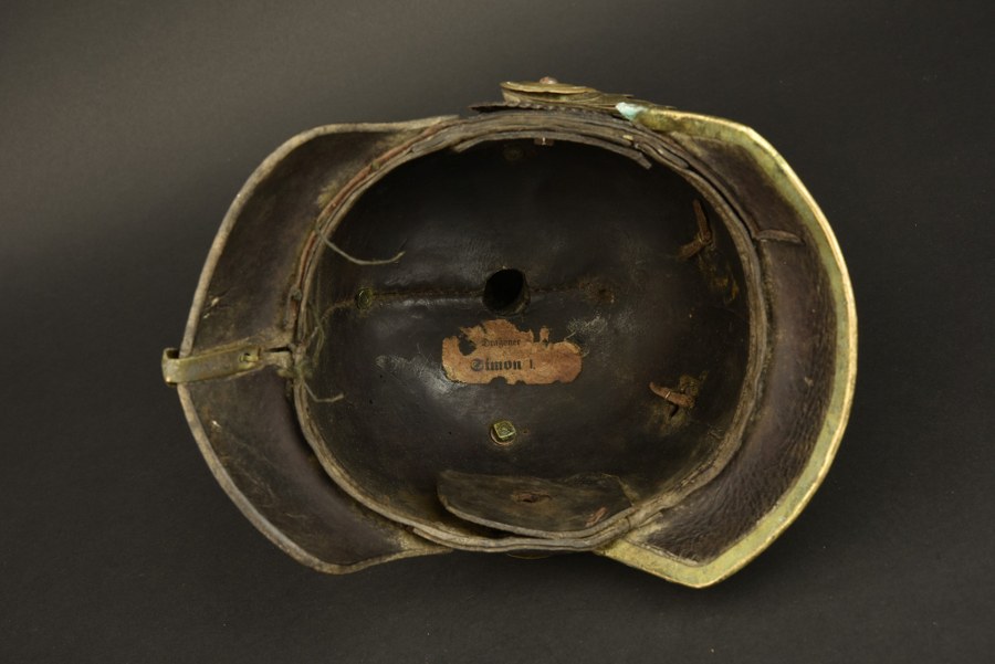 Casque de Dragon modèle 1860, composite. Bombe haute, Pointe sur embase trèfle avec Perlring, non homogène avec la bombe et un rivet manquant. Jonc arrière avec rivets ovalisés, un manquant. Plaque à l'aigle prussien modèle 1842 modifiée 1860 par ajout du Vaterbandeau. Jugulaires à écailles bombées et une Reichskokarde cavalerie. Plusieurs rivets, vis ou écrous sont des remplacements. Coiffe absente. Nominette au nom du Dragoner Simon à l'intérieur. Forte usure et patine de l'objet. Plus de photos sur WWW.AIOLFI.COM, more photos on WWW.AIOLFI.COM.