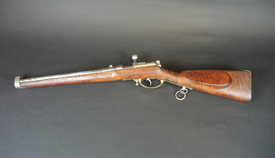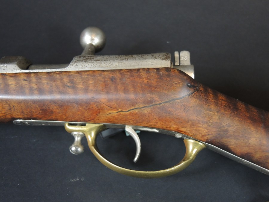 Mousqueton de cavalerie Dreyse modèle 1857Joli et rare carabine de cavalerie Dreyse modèle 1857. Crosse en noyer sans marquage, probablement refaite et réparée. Plaque de couche en laiton régimentée au 7e Hussards. Boîtier marqué Sommerda ND mod.57. Boîtier et culasse datés tous deux 1860 et 1861. Les parties métalliques semblent avoir été nickelées. Arme à poudre noire catégorie D2. Plus de photos sur WWW.AIOLFI.COM, more photos on WWW.AIOLFI.COM.