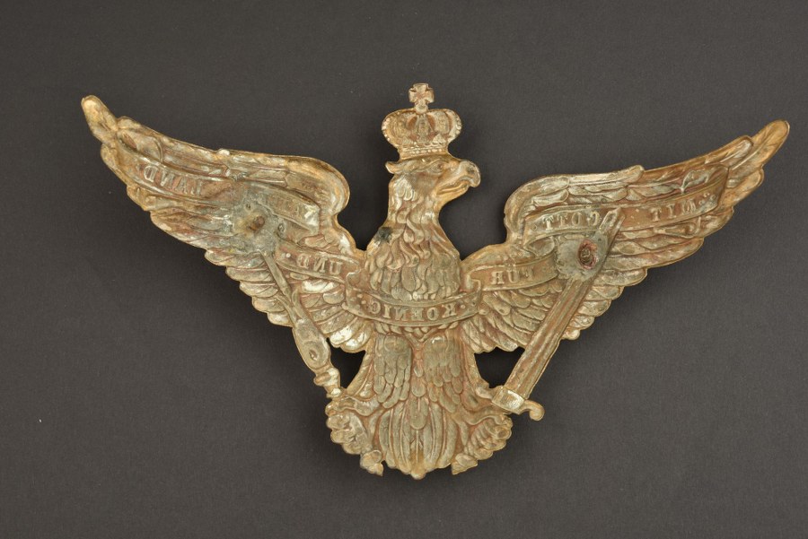 Plaque de casque à pointe de Grenadier modèle 1860Grand aigle de Grenadier de la Garde en laiton, garde du glaive en S, vis de fixation soudées d'origine. Plus de photos sur WWW.AIOLFI.COM, more photos on WWW.AIOLFI.COM.