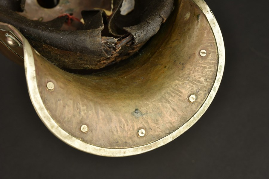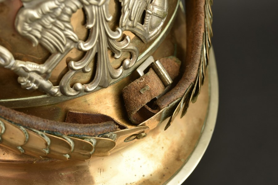 Casque à pointe modèle 1862-67 du 6e régiment de Cuirassiers Casque de cuirassier en tombac à garnitures maillechort, avec plaque à l'aigle prussien maillechort, spécifique au 6e régiment de Kurassier. Plaque fixée par vis à tête en forme de plume, petits écrous hexagonaux. Vis sans garantie. Bombe avec 2 jeux de percement, non marquée. Jugulaires à écailles bombées fixées par vis avec rosaces percées. Grande cocarde Prusse de cavalerie. Coiffe en cuir à dents de loups. Plus de photos sur WWW.AIOLFI.COM, more photos on WWW.AIOLFI.COM.