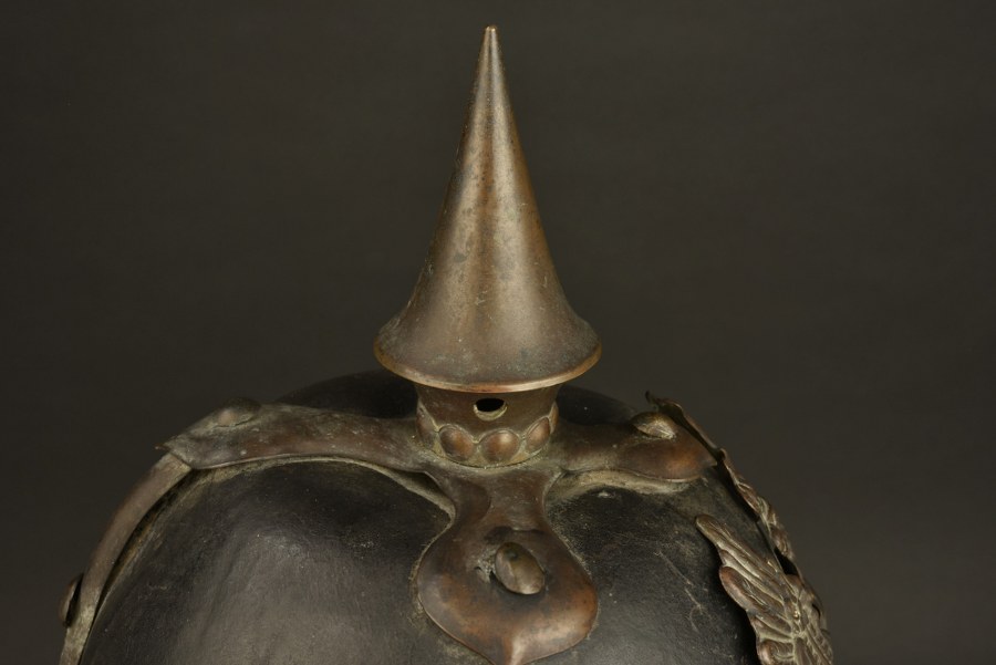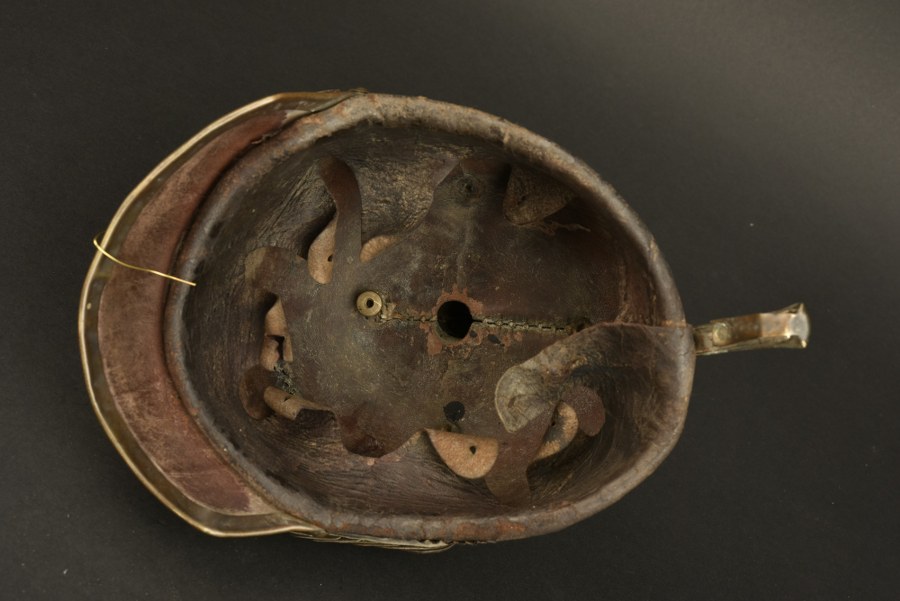 Relique de casque à pointe modèle 1860 prussien casque à pointe modèle 1860 avec plaque prussienne fixation par vis, une est manquante, et l'autre, écrou postérieur. Pointe avec Perlring sur embase trèfle, une fixation manquante, une autre est un remplacement. Jonc arrière avec 2 rivets, un manquant. Visière carrée avec jonc, nuquière absente. Grande cocarde Prusse modèle 1860 et une demi jugulaire à écailles plates. Coiffe présente. Usure et patine. Un beau projet de restauration ou une réserve de pièces détachées. Plus de photos sur WWW.AIOLFI.COM, more photos on WWW.AIOLFI.COM.