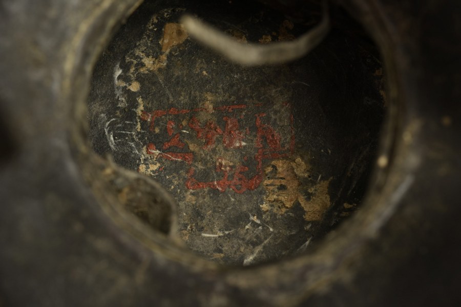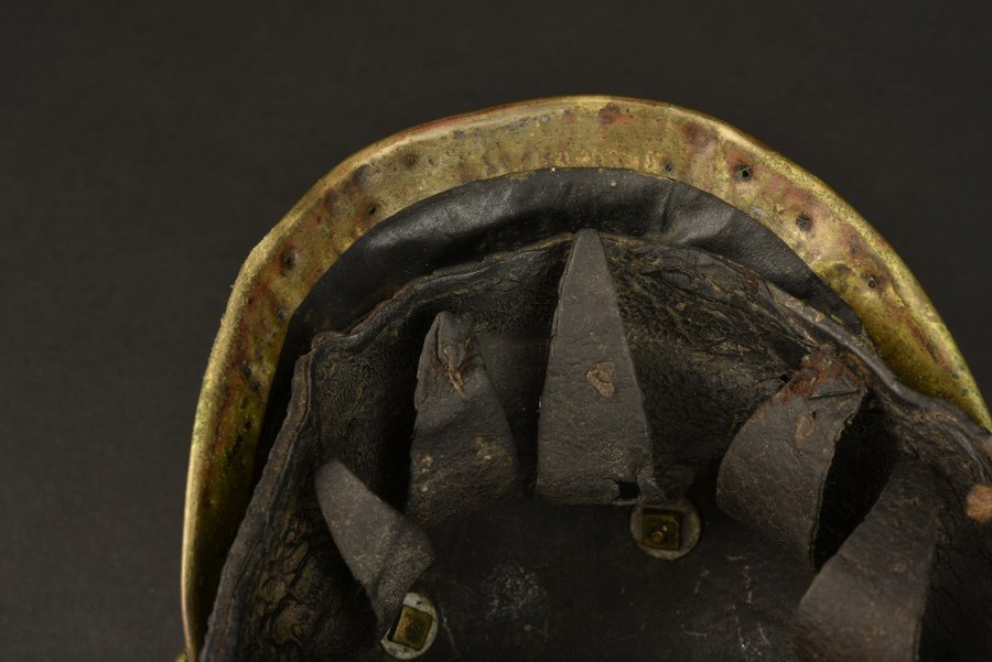 Tschapka de sous officier de Uhlan prussien modèle 1868Tschapka en cuir troupe modèle 1868 à plateau large de 18 cm de côté. Un manque sur un des coins laisse apparaitre le renfort en fer. Petit aigle et jonc de visière en laiton. Fortes jugulaires à écailles bombées fixées par rosaces percée. Grande cocarde Reich. Cordon raquette bicolore de sous officier, décoloration et usure. Coiffe à fines dents en pointe, sèche. Marquage régimentaire à la peinture rouge à l'intérieur du pavillon, difficilement lisible. Usure et patine. Plus de photos sur WWW.AIOLFI.COM, more photos on WWW.AIOLFI.COM.