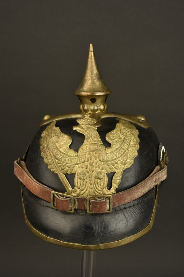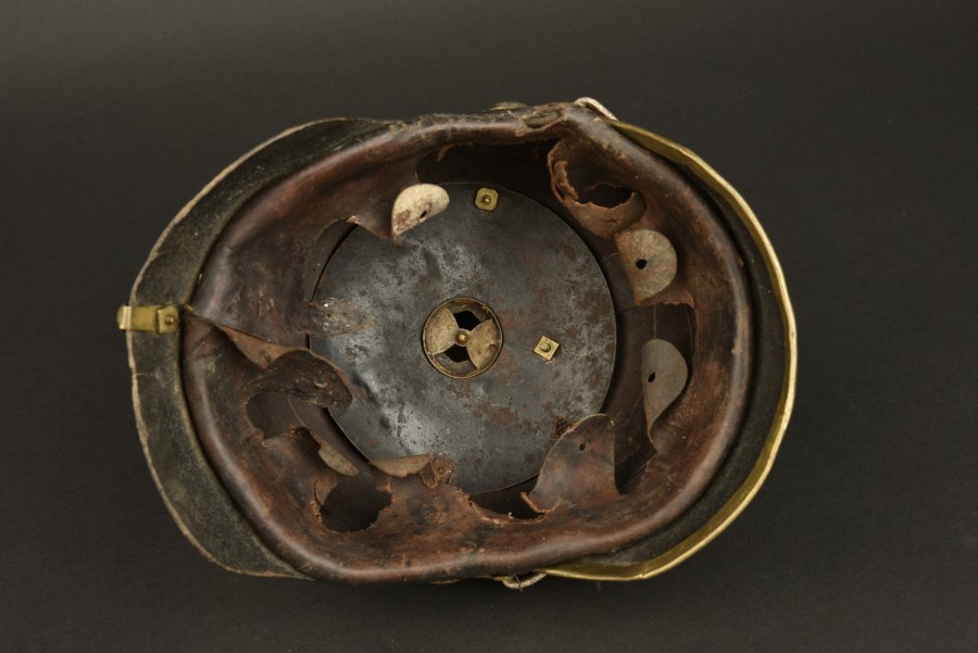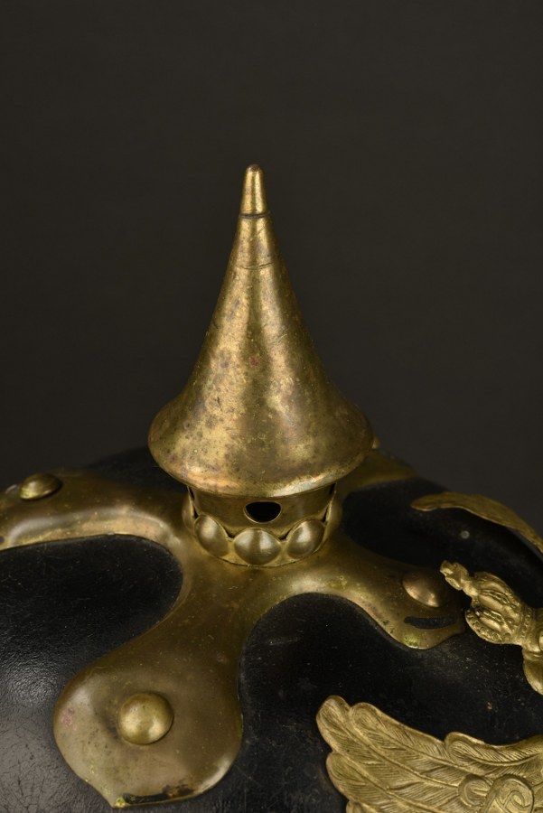 Casque de Dragon modèle 1867-1894Casque troupe de Dragon, à garnitures laiton pour les régiments 7, 8, 11, 13 et 14. Bombe avec 2 jeux de percement de plaque. Pointe dévissable avec Perlring sur embase trèfle. Aigle de dragon laiton avec ses pontets soudés d'origine. Un coin de cuir manquant. Cocardes reproduction. Jugulaire sans garantie. Nuquière en carton, pas de marquage visible. Coiffe en cuir brun avec usure et manques. Une intéressante contre plaque large avec système de virole de ventilation. Plus de photos sur WWW.AIOLFI.COM, more photos on WWW.AIOLFI.COM.