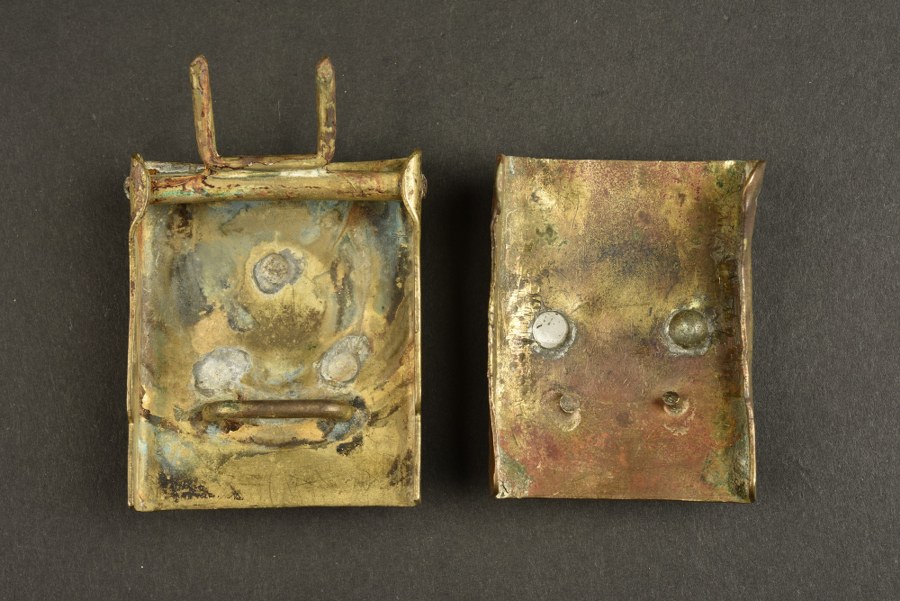 Lot de 2 boucles de ceinturon prussienne slot composé d'une boucle prussienne modèle 1847 en bon état, et d'une boucle modèle 1895 en tombac dont l'axe est manquant et le pontet cassé. Plus de photos sur WWW.AIOLFI.COM, more photos on WWW.AIOLFI.COM.