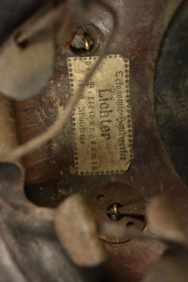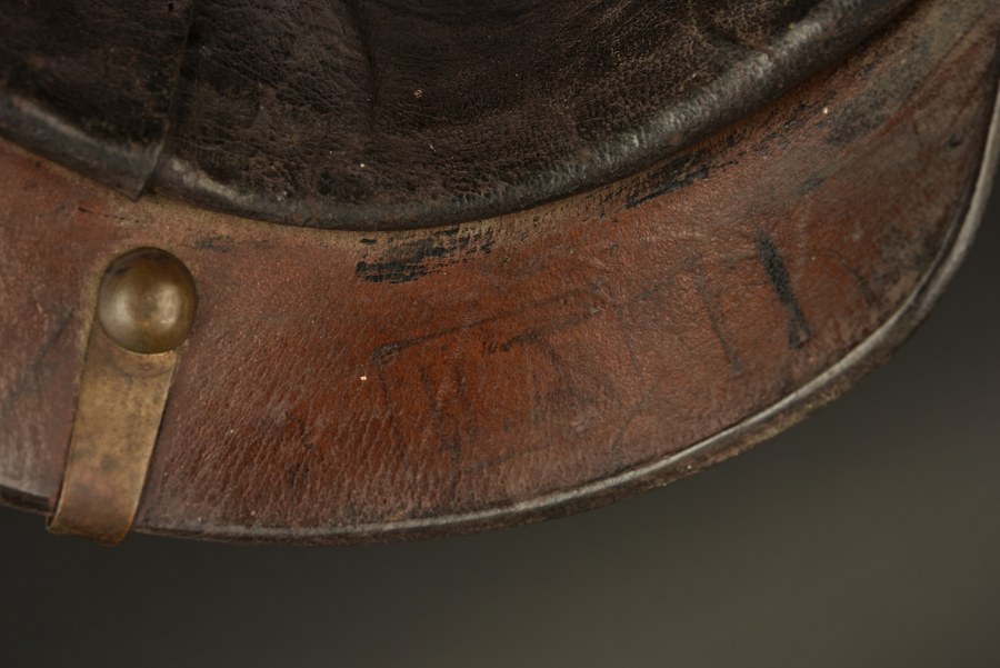 Casque à pointe troupe 1891 d'un travailleur du BA XVI Casque à pointe modèle 1891 à tourillons à grosses boules et jonc arrière sans aérateur. Bien marqué du BA XVI avec nominette d'un Oekonomie Handwerker du BA XVI, réceptionné en 1896. Bonnes cocardes et bonne jugulaire. Coiffe en bon état. A part les trous de fixation de plaque agrandis, un casque dans son jus. Plus de photos sur WWW.AIOLFI.COM, more photos on WWW.AIOLFI.COM.