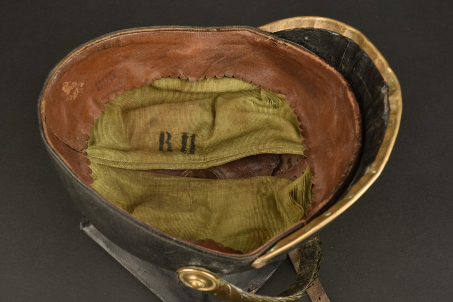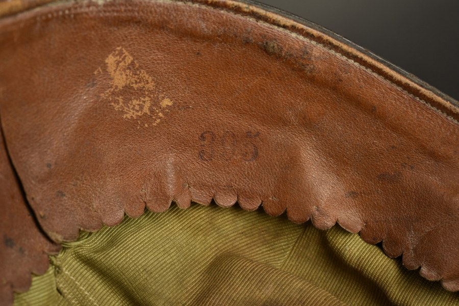 Tschapka d'officier de Ulan prussien, plaque des vieux régiments Tschapka d'officier de Ulan prussien à garnitures laiton. Belle plaque à l'aigle dite des vieux régiments avec monogramme FWR, à vis. Jugulaires à écailles bombées. Une cocarde Prusse type officier. Visière décousue tenant par les rivets. Coups et craquelures de vernis sur la bombe. Intérieur type officier avec bandeau de sudation en cuir brun et soie verte, état d'usure important. Renfort interne en cuir du pavillon sec et partiellement décollé. Plus de photos sur WWW.AIOLFI.COM, more photos on WWW.AIOLFI.COM.