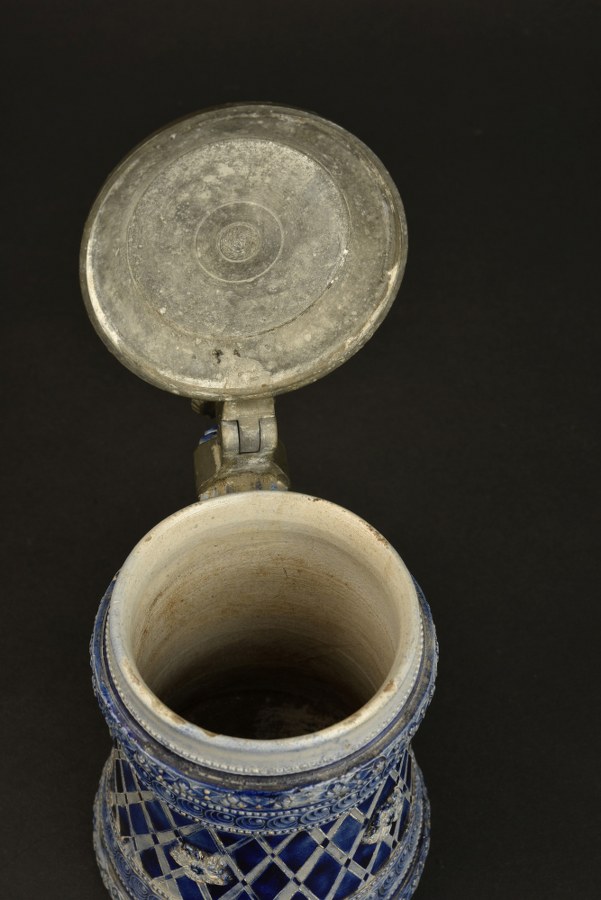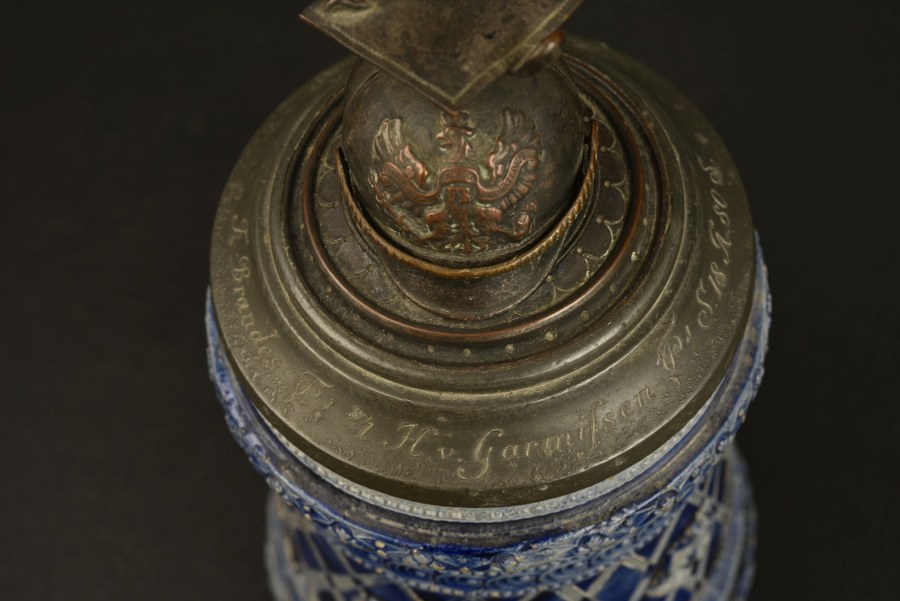Lot de 2 chopes patriotiques et estudiantine Lot de 2 chopes. Une chope en verre à facettes, quelques ébréchures sur sa base, couvercle en étain plat, surmonté d'un casque à pointe de la Garde et pièce de pouce figurant un aigle. Une autre chope en grès émaillé à motifs, quelques coups minimes sur le haut, couvercle surmonté d'une Tschapka prussienne, la jugulaire est mobile et inscriptions d'une confrérie d'étudiants de Garmissen en Basse Saxe. Plus de photos sur WWW.AIOLFI.COM, more photos on WWW.AIOLFI.COM.