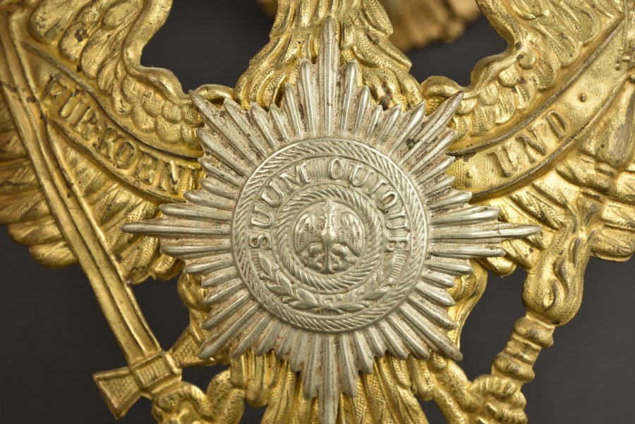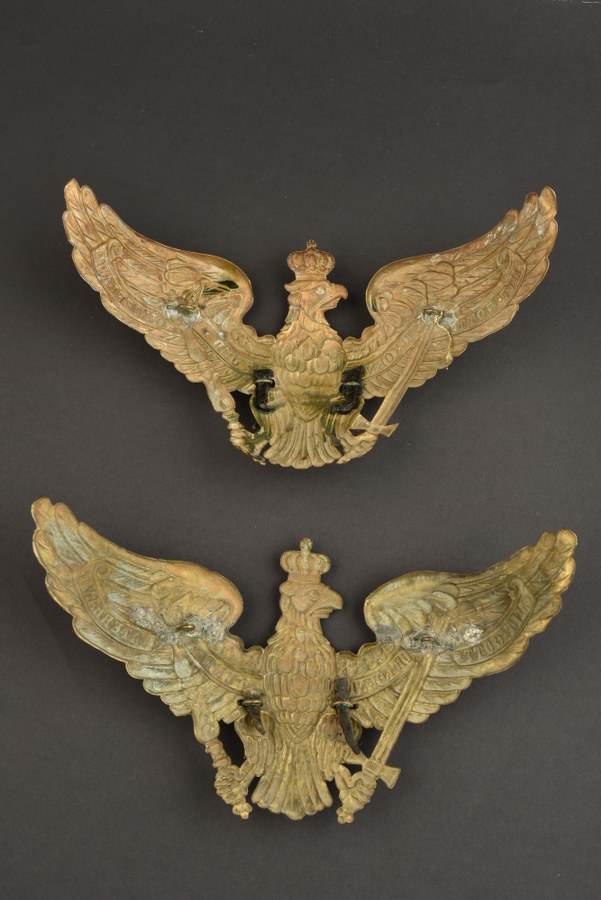 Duo de plaques de casques à pointe de la Garde modèle 1895 Deux belles plaques de la Garde, grand aigle en laiton, étoile de la Garde en maillechort. L'une avec ses pontets soudés d'origine, l'autre avec un des pontets ressoudé. Plus de photos sur WWW.AIOLFI.COM, more photos on WWW.AIOLFI.COM.