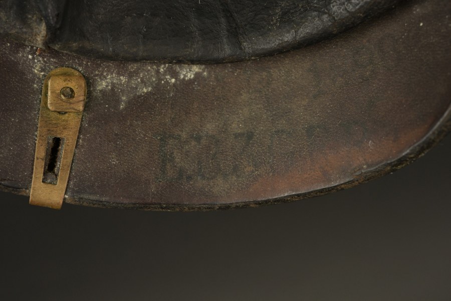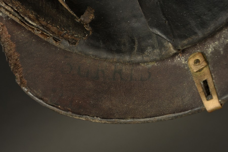 Casque à pointe de Grenadier de la Garde casque à pointe troupe modèle 1895. Plaque au grand aigle avec étoile de la Garde, jolie dorure, les coins de cuir étant fermement bloqués dans les pontets, la plaque n'a pas été démontée mais tout semble d'origine. Pointe laiton dévissable. Bombe non repercée. Bonnes cocarde, bonne jugulaire à grosses clés, conforme pour un régiment de la Garde. Coiffe en cuir noir, un manque important dû à un rongeur. Nom manuscrit dans la bombe. Nuquière bien marquée 3GRR IB et EB 3GRR. Plus de photos sur WWW.AIOLFI.COM, more photos on WWW.AIOLFI.COM.