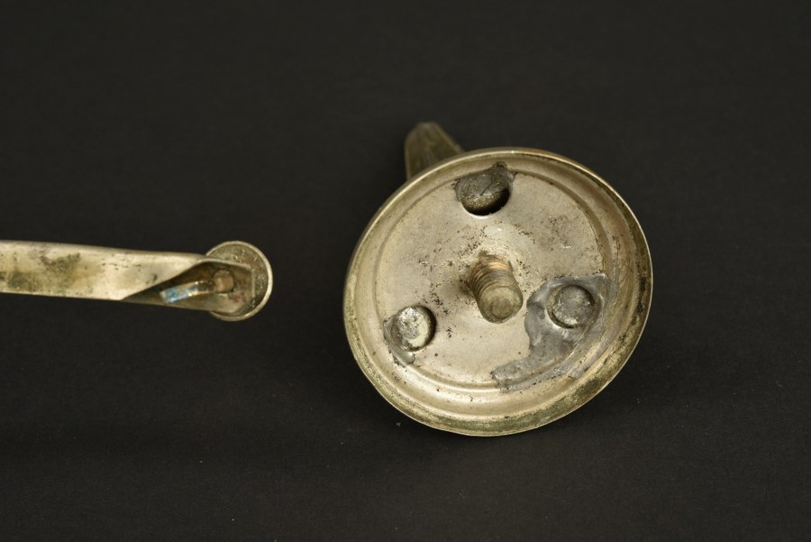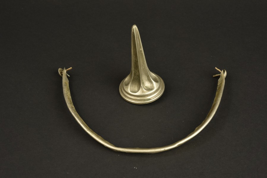 Pointe d'officier maillechort et jonc de visière Ensemble composé d'une pointe cannelée blanche avec tige filetée pleine et d'un jonc de renfort de visière en maillechort avec ses deux rivets fendus tête ronde. Plus de photos sur WWW.AIOLFI.COM, more photos on WWW.AIOLFI.COM.