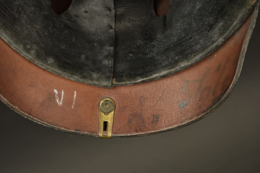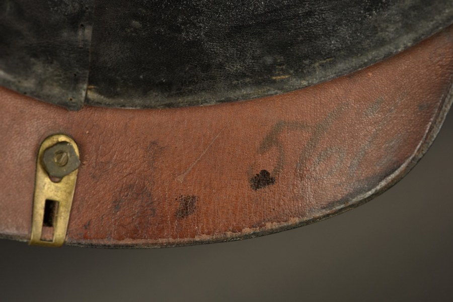 Casque de sous-officier de grenadier Casque de sous officier avec pointe cannelée fixe avec Perlring sur embase trèfle, fixée par vis à têtes rondes. Bombe de grande taille, avec plusieurs ajustements des percements de fixation de plaque, masqués côté interne par des rondelles. Superbe plaque d'officier de grenadier, grand aigle à couronne ajourée avec une très belle dorure et vis soudées d'origine. Jonc arrière sans aérateur. Coiffe intérieure à dents de loup type troupe. Jugulaire en cuir épais. Cocardes absentes. Plus de photos sur WWW.AIOLFI.COM, more photos on WWW.AIOLFI.COM.