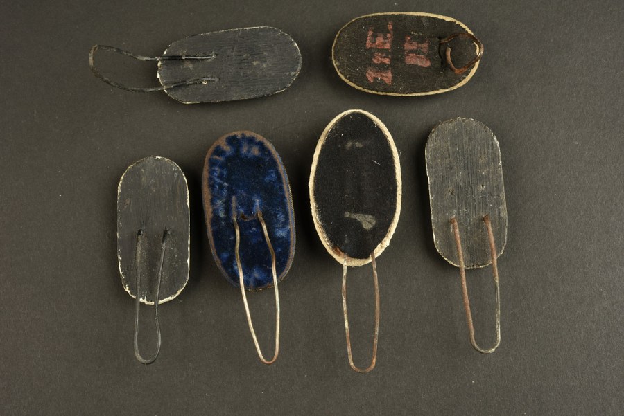 Lot de 6 Feldzeichen pour Tschako Lot de 6 Feldzeichen pour Tschako, copies en bois peintes, un officier bavarois, un badois peint, un prussien repeint et cassé, le tout sans garantie. Plus de photos sur WWW.AIOLFI.COM, more photos on WWW.AIOLFI.COM.