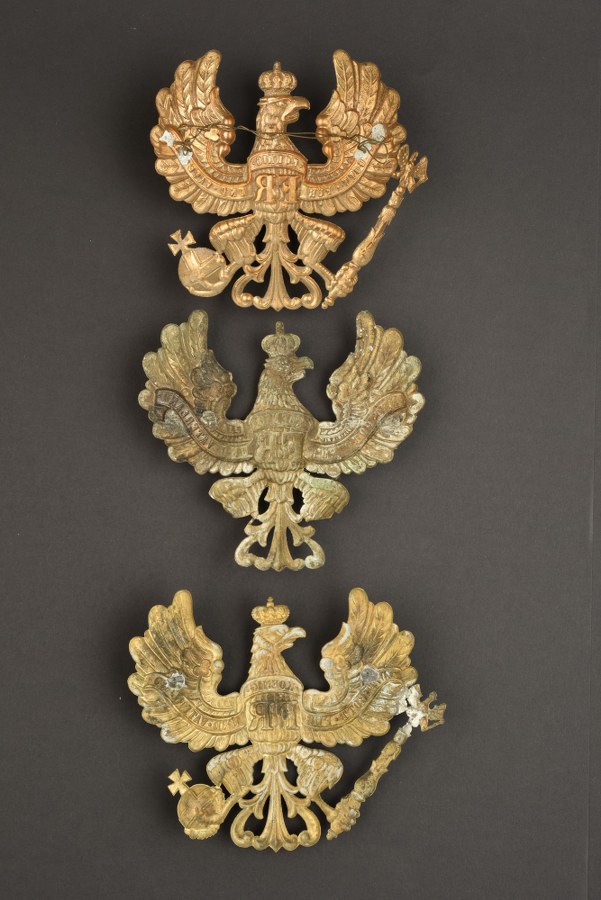 Ensemble de 3 plaques de casque prussien modèle 1895 Une superbe plaque avec ses pontets soudés d'origine, une plaque à vis manquantes et une réparation au niveau de l'aigle du sceptre, et une plaque dont les pontets, le sceptre et l'orbe manquent. Plus de photos sur WWW.AIOLFI.COM, more photos on WWW.AIOLFI.COM.