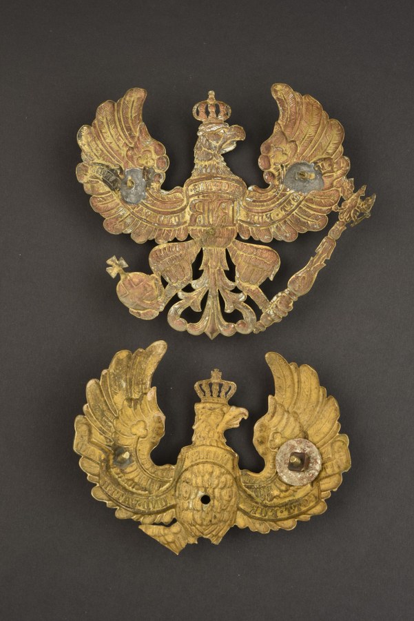 Plaques de casque à pointe d'officier Une belle plaque d'officier, aigle à couronne ajourée, vis de fixation soudées d'origine. On y joint une relique de plaque d'officier d'un petit état avec banderole Fuerst. Plus de photos sur WWW.AIOLFI.COM, more photos on WWW.AIOLFI.COM.