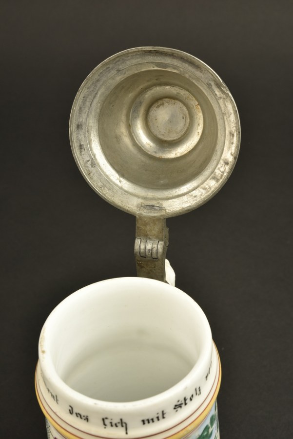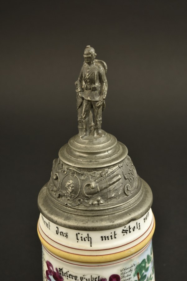 Chope de réserviste du Fusilier Regiment 80 de Hanau Chope en porcelaine à motifs rehaussés à la main. Ebréchée sur la base. Couvercle d'origine surmonté d'un soldat. La pièce de pouce a été coupée à ras. Hauteur 26,5 cm, usure et patine. Plus de photos sur WWW.AIOLFI.COM, more photos on WWW.AIOLFI.COM.