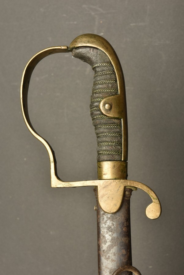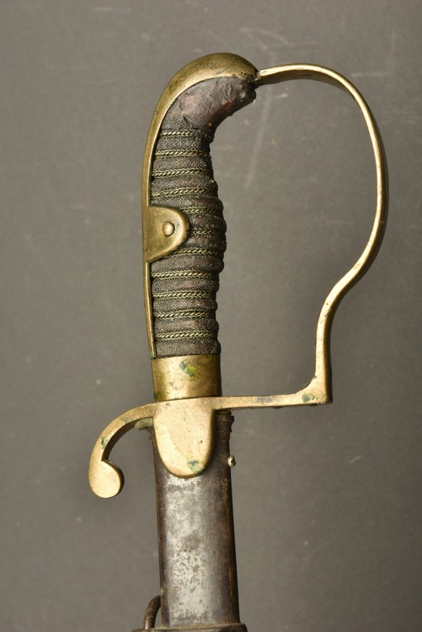 Sabre d'officier d'infanterie allemand Sabre d'officier à lame droite, dos plat, à deux gouttières. Fabricant WKC. Poignée bois recouverte de galuchat et filigrane, manque de galuchat au niveau du pommeau. Fourreau à 2 colliers mais un seul anneau conservé donc modifié en 1910. Quelques coups, une vis de chape manquante. Usure et patine. Plus de photos sur WWW.AIOLFI.COM, more photos on WWW.AIOLFI.COM.