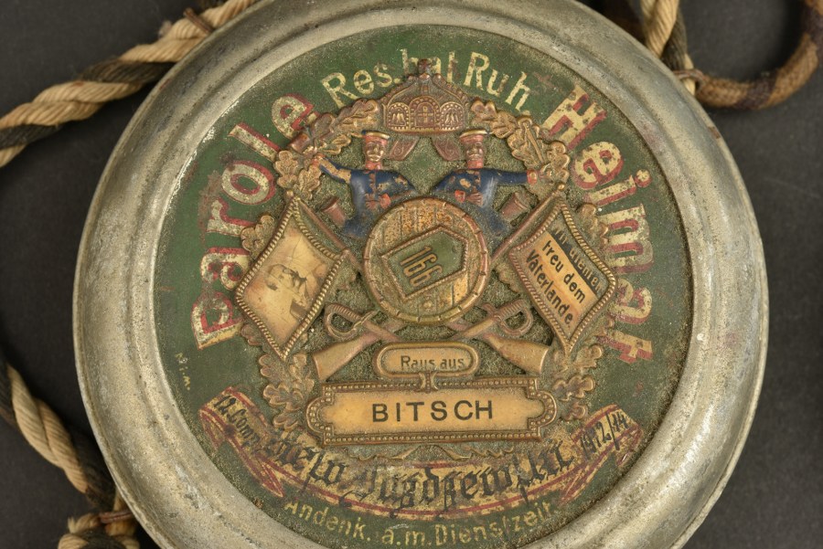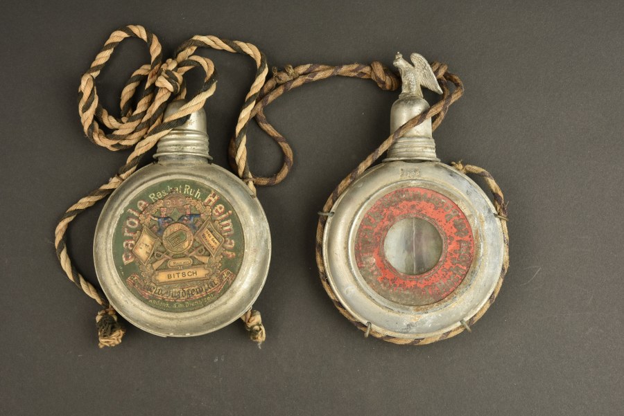 2 Gourdes de réserviste en verre dont une du JR 166 de Bitsch Gourde en verre avec coque en métal blanc, avers marqué au Infanterie Regiment Nr 166 de Bitsch, en 1912-1914. Avec son bouchon et cordon aux couleurs de la Prusse. Une seconde en verre cerclée de métal blanc, non marquée d'un régiment, avec cordon noir et blanc et bouchon surmonté d'un aigle impérial. Usure et patine. Plus de photos sur WWW.AIOLFI.COM, more photos on WWW.AIOLFI.COM.