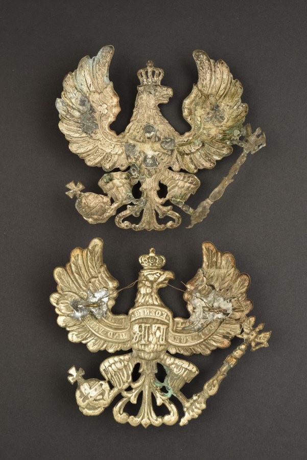 Ensemble de 2 plaques de casque à pointe Pionnier prussiens Ensemble de plaques de casque à pointe en maillechort pour Pionnier. Une troupe modèle 1895, pontets ressoudés. Une plaque officier de réserve avec couronne ajourée et croix de réserve König avec quelques renforts d'époque, fixations absentes. Plus de photos sur WWW.AIOLFI.COM, more photos on WWW.AIOLFI.COM.