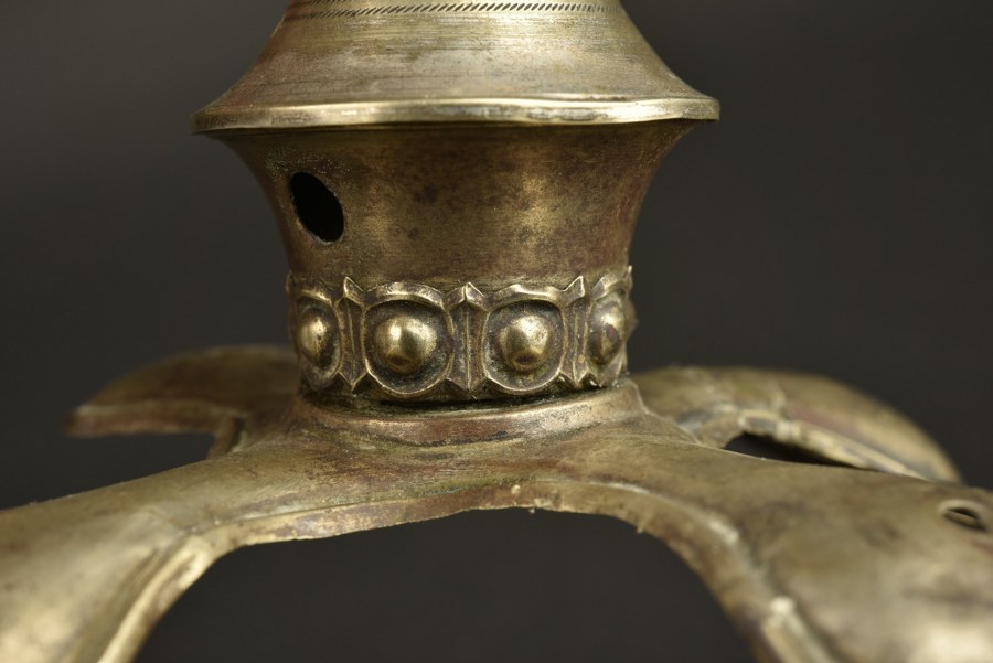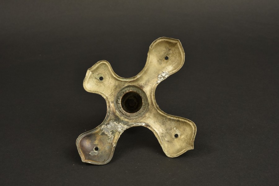 Pointe de casque de sous officier en maillechort Pointe courte, dévissable, sur embase en croix avec Perlring. La branche droite de l'embase a été complètement ressoudée, d'autres petites réparations. La partie de l'embase ou se visse la pointe étant plate, plutôt un sous officier de Pionnier. Plus de photos sur WWW.AIOLFI.COM, more photos on WWW.AIOLFI.COM.