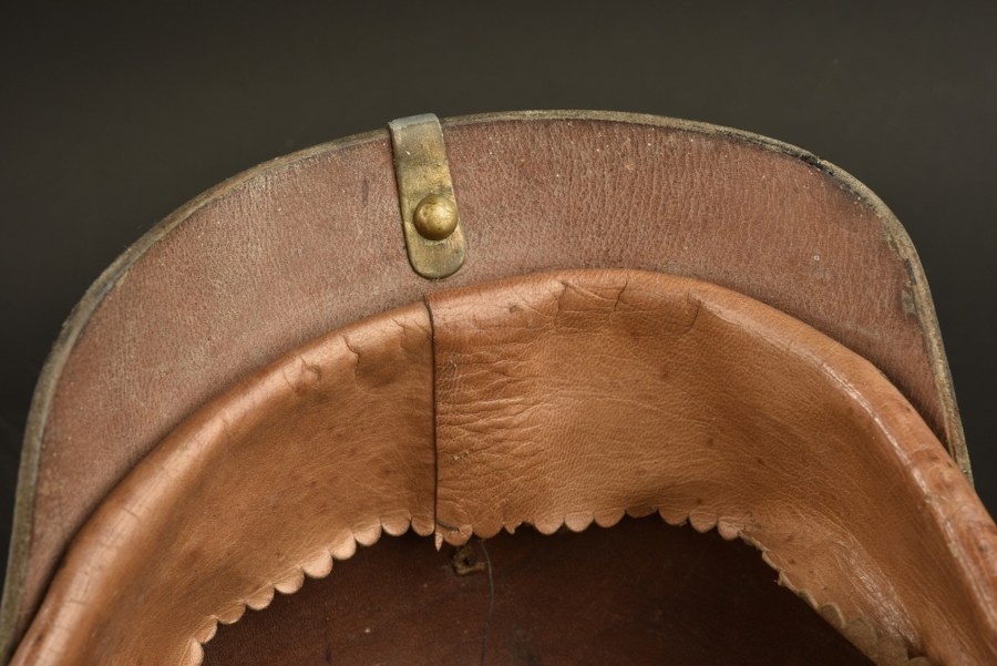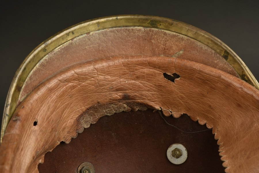 Casque à pointe d'officier de réserve Artillerie ou Train prussien Plaque d'officier de réserve à l'aigle prussien avec une très belle dorure, fixation par tiges filetées avec rondelles et écrous hexagonaux, croix de réserve maillechort. Bombe cuir en bon état, avec un jeu de grands trous pour la plaque. Embase de pointe ronde fixées par vis tête étoile, monté avec un Haarbusch en crin noir, anciennes traces de colle sur le dessus. Bandeau de sudation en cuir, soie absente. Bonnes cocardes officier, jugulaires à écailles bombées fixées par rosettes à pattes repliables. Pour officier d'artillerie ou du Train. Plus de photos sur WWW.AIOLFI.COM, more photos on WWW.AIOLFI.COM.