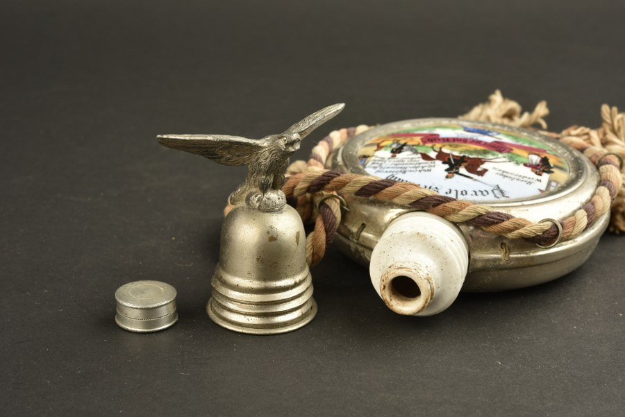 Gourde de réserviste du Feld Artillerie Rgt 8 de Saarlouis jolie gourde de réserviste en porcelaine peinte, cerclée de métal. Bouchon surmonté d'un aigle, le bec est cassé. Cordon aux couleurs impériales allemande avec pompons . Marqué au FAR 8 de Saarlouis. Usure et patine. Plus de photos sur WWW.AIOLFI.COM, more photos on WWW.AIOLFI.COM.