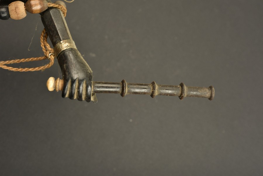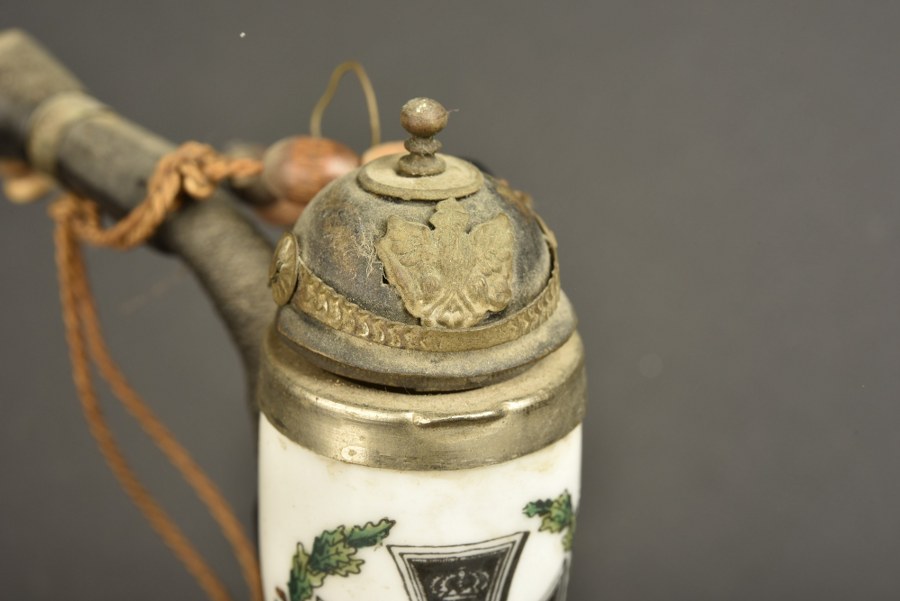 Pipe patriotique à croix de fer Pipe en porcelaine à motif de croix de fer 1914, surmontée d'un couvercle en forme de casque d'artilleur prussien. Sur un intéressant assemblage de tubes dont le tube de bouche est tenue par une main sculptée. En bon état, légère usure et patine. Plus de photos sur WWW.AIOLFI.COM, more photos on WWW.AIOLFI.COM.