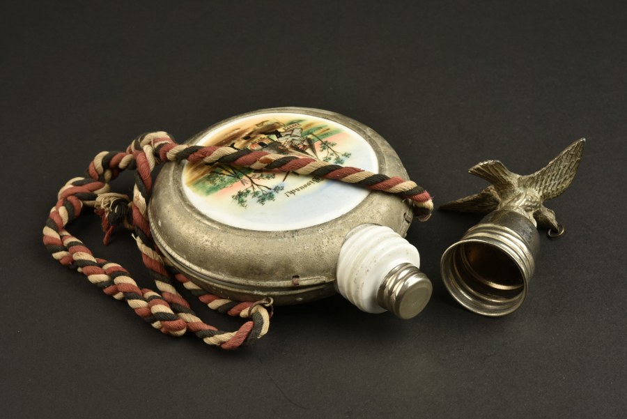 Gourde de réserviste en porcelaine Jolie gourde en porcelaine peinte à motifs de soldats en uniformes Feldgrau donc après 1907, représentant une scène de bivouac. Coque en métal blanc avec bouchon surmonté d'un aigle. Bon état. Plus de photos sur WWW.AIOLFI.COM, more photos on WWW.AIOLFI.COM.