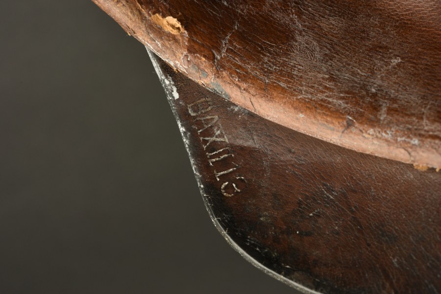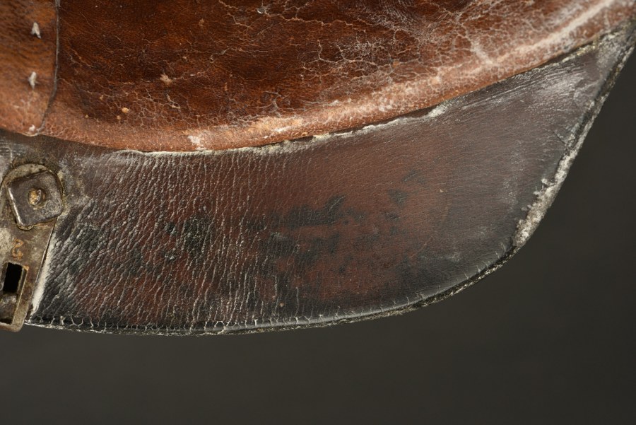 Casque à pointe modèle 1915 prussien Casque à pointe troupe modèle 15 à garnitures fer. Plaque prussienne, pointe amovible à baïonnette, difficile à retirer du casque. Bonne Reichscocarde, jugulaire et cocarde Prusse reproduction. Bombe en bon état, non repercée. Intérieur en bon état, coiffe à dents de loup en cuir marron. La nuquière, solidaire du casque par le jonc et les coutures latérales, est décousue voir rapportée, curieusement marquée BA XII 13 saxon. Peut être une réparation d'époque. Plus de photos sur WWW.AIOLFI.COM, more photos on WWW.AIOLFI.COM.