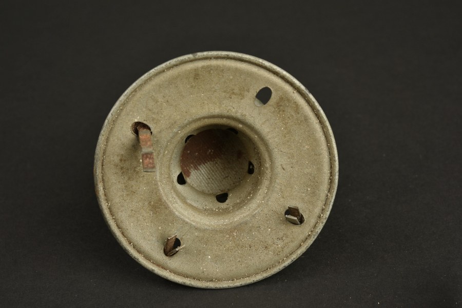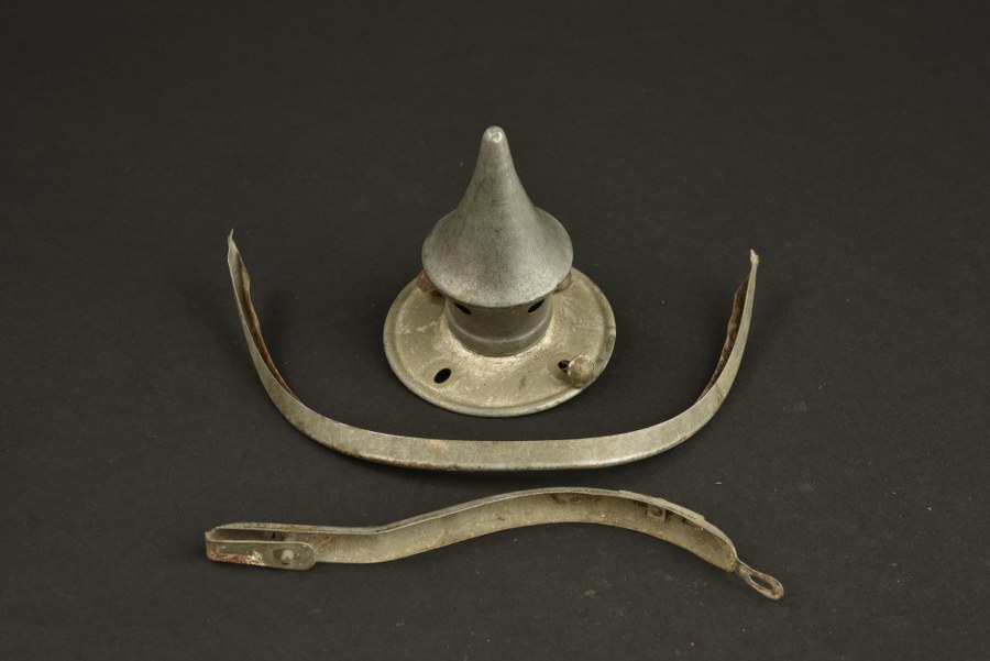 Pièces détachées de casque à pointe modèle 1915 Pointe amovible modèle 1915 en fer peint sur son embase ronde avec 3 de ses rivets de fixation, un jonc de renfort de visière et un jonc arrière de casque. Plus de photos sur WWW.AIOLFI.COM, more photos on WWW.AIOLFI.COM.