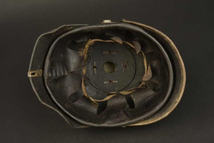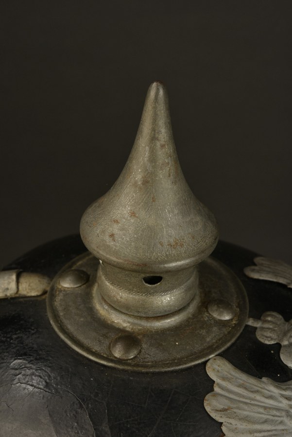 Casque à pointe prussien modèle 1915 Casque à pointe troupe modèle 1915 à garnitures en fer peintes gris feldgrau. Plaque à l'aigle prussien à pontets. Pointe amovible. Bombe non repercée, ayant subi un choc côté droit au niveau du tourillon, le cuir est cassé. Coiffe d'origine, casque graissé mais pas sec, pas de marquage visible. Cocardes absentes, bonne jugulaire. Plus de photos sur WWW.AIOLFI.COM, more photos on WWW.AIOLFI.COM.