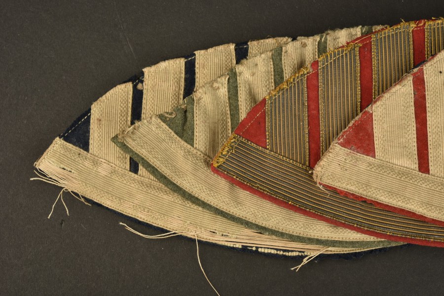 Lot de 6 nids d'hirondelles de musiciens, Schwalbennest Lot composé de 2 paires de nids d'hirondelles d'épaule de musiciens, et de deux nids seuls, différentes couleurs dont un feldgrau. Usure et patine. Plus de photos sur WWW.AIOLFI.COM, more photos on WWW.AIOLFI.COM.