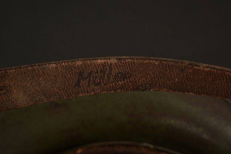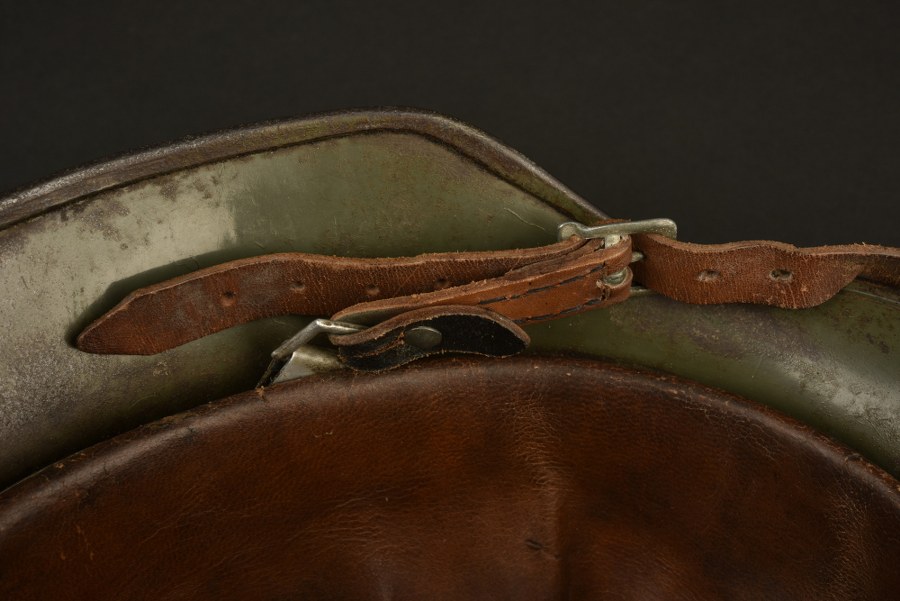 Casque camouflé. Coque de casque M35. Fabrication Q64, numéro de lot 887. Pourtour interne disposant d'une peinture Feldgrau à 60%. Peinture camouflé trois tons ocre/vert/sable à 80%, postérieure. Trace de double insigne sous la peinture camouflé. Les couleurs nationales ont partiellement étaient grattées. Coiffe en cuir complète. Cordon de serrage présent. Jugulaire en cuir complète, mais postérieure. Indication nominative Müller sous la jugulaire. L'authenticité du camouflage n'est pas garantie. A noter une certaine usure et patine de la pièce. Etat II+. Plus de photos sur WWW.AIOLFI.COM, more photos on WWW.AIOLFI.COM.