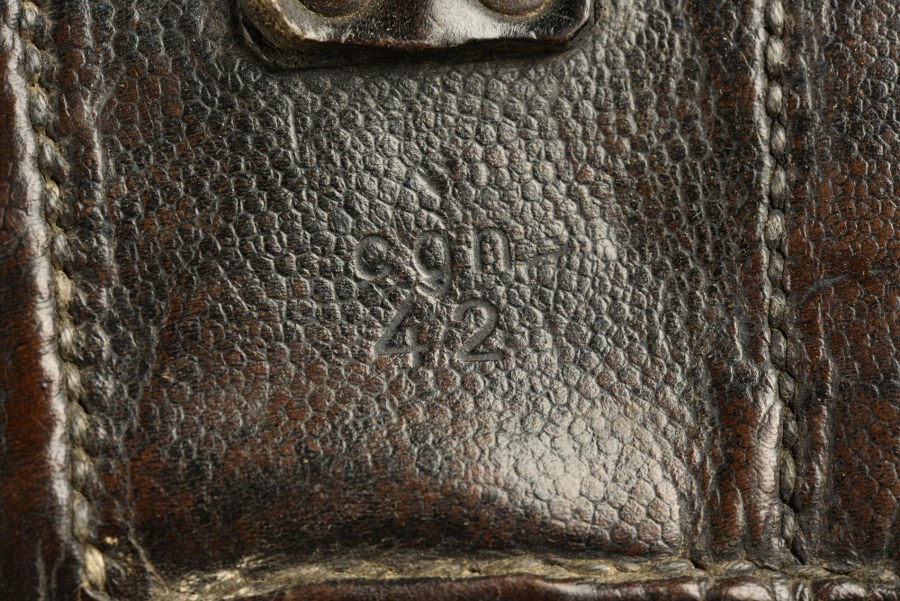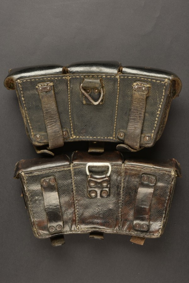 Cartouchières Mauser 98K. Paire non homogène. En cuir grenelé noir. Les sangles de fermeture sont complètes. Les racks interne sont présents. Bouclerie en métal. Fabrication illisible. A noter une certaine usure et patine des pièces. Etat II+. Plus de photos sur WWW.AIOLFI.COM, more photos on WWW.AIOLFI.COM.