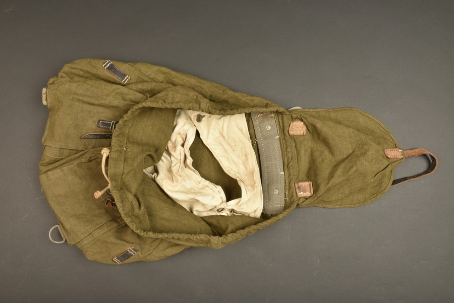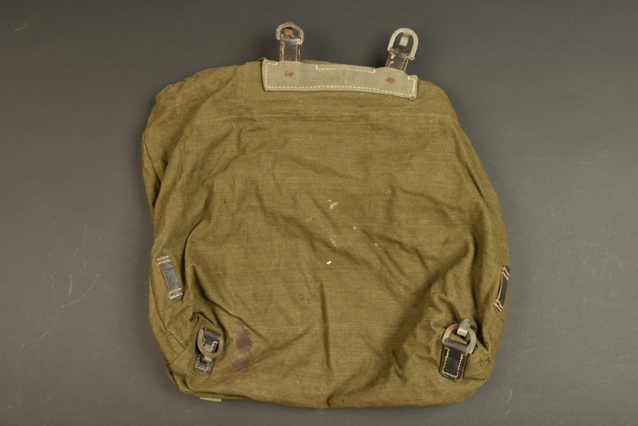 Sac à dos de la Heer. En forte toile Feldgrau et cuir noir. Les bretelles sont manquantes. Le cordon de serrage est présent. Sans marquages visibles. A noter une certaine usure et patine de la pièce. Etat II+. Plus de photos sur WWW.AIOLFI.COM, more photos on WWW.AIOLFI.COM.