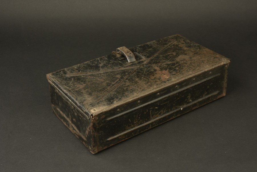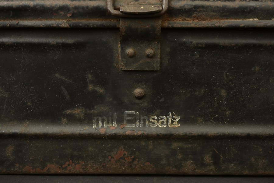Caisse pour vélo allemand. En métal, peinture noire à 80%. Une patte de fixation incomplète. Crochet de fermeture complet et fonctionnel. Marquages Mit Einsatz. A noter une certaine usure et oxydation de la pièce. Etat II +. Plus de photos sur WWW.AIOLFI.COM, more photos on WWW.AIOLFI.COM.