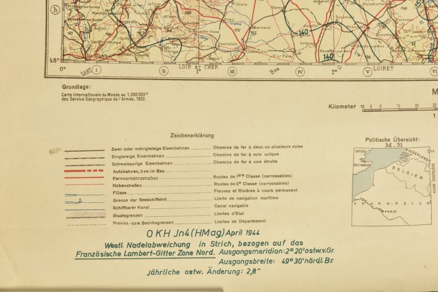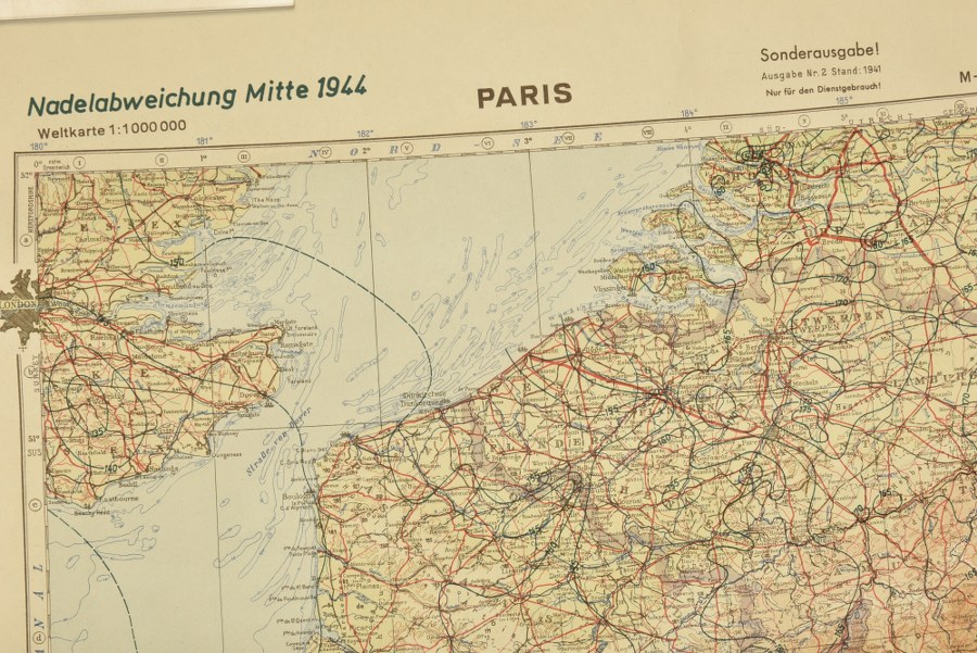 Carte Paris Normandie. En papier, couvrant la région de Paris et d'une partie de la Normandie. Texte en français/allemand. Datée 1944. A noter une certaine usure et patine de la pièce. Etat II+. Plus de photos sur WWW.AIOLFI.COM, more photos on WWW.AIOLFI.COM.