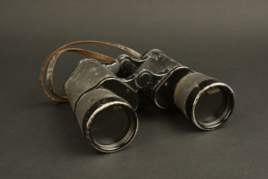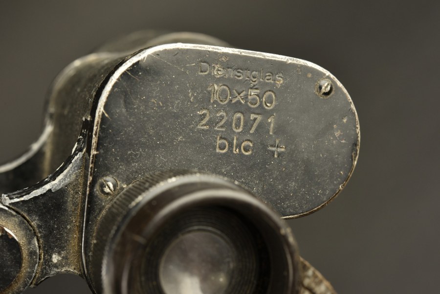 Jumelles allemande. Revêtement présentant des manques. Un protège oculaire manquant. Marquages Dienstglass 10 x 50 22071 BLC. Optiques claires mais présentant des tâches. Protège oculaire en caoutchouc, un morceau est manquant. Lanière en cuir complète. A noter une certaine usure et patine de la pièce. Etat II-. Plus de photos sur WWW.AIOLFI.COM, more photos on WWW.AIOLFI.COM.