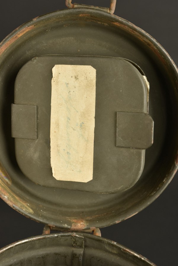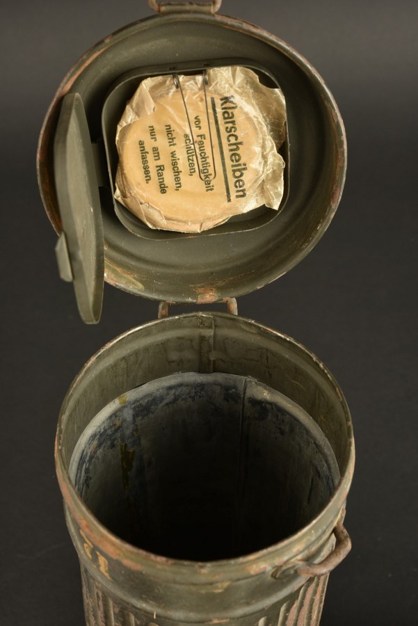 Masque anti-gaz allemand. Boitier long. Peinture Feldgrau à 60%. Seule la petite sangle est présente. Numéro 71 peint sur le côté du boitier. Verres de rechange présents sous le couvercle. Etiquette nominative sous le couvercle. Illisible. Masque en toile taille 2. Toutes les sangles sont présentes. Marquage 71 à la base du masque. Filtre absent. Araignée et chiffon absents. A noter une certaine usure et patine de la pièce. Etat II+. Plus de photos sur WWW.AIOLFI.COM, more photos on WWW.AIOLFI.COM.