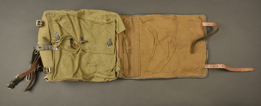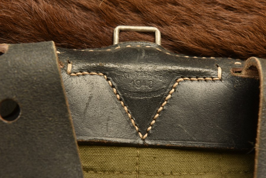 Sac à dos poils de vache. En forte toile coton Feldgrau. Poils de vache marron. Toutes les sangles sont présentes, ainsi que toutes les pièces métalliques. Les bretelles sont complètes. Daté 1940. A noter une légère usure et patine de la pièce. Etat I-. Plus de photos sur WWW.AIOLFI.COM, more photos on WWW.AIOLFI.COM.