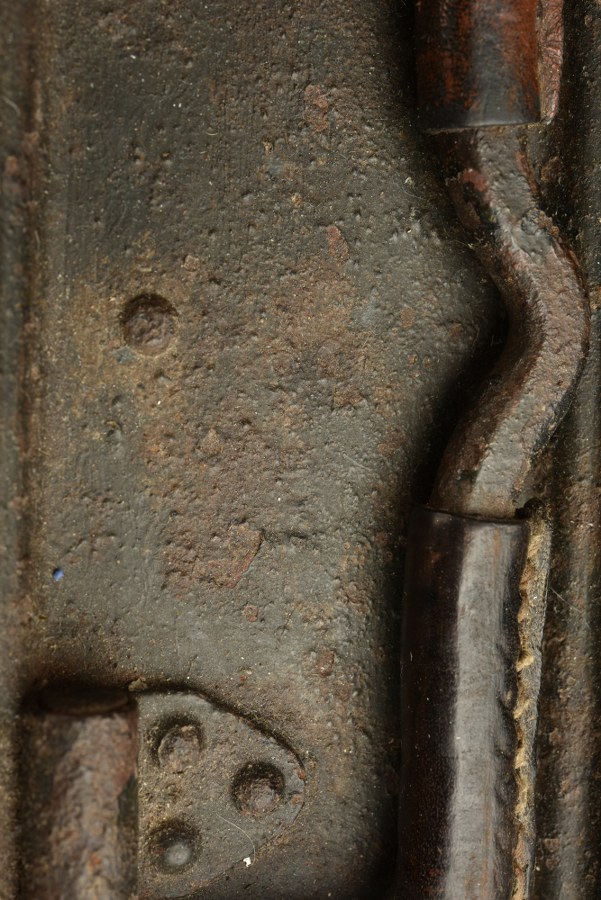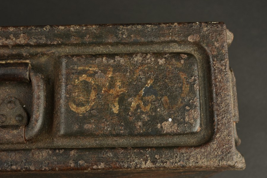 Caisse MG. En métal, peinture Feldgrau à 40%. Toutes les pièces métalliques sont oxydées. Marquage 3425. Les poignées disposent toutes de leur renfort en cuir. A noter une certaine usure et oxydation de la pièce. Selon les informations du vendeur cette pièce provient en Normandie. Etat II+. Plus de photos sur WWW.AIOLFI.COM, more photos on WWW.AIOLFI.COM.