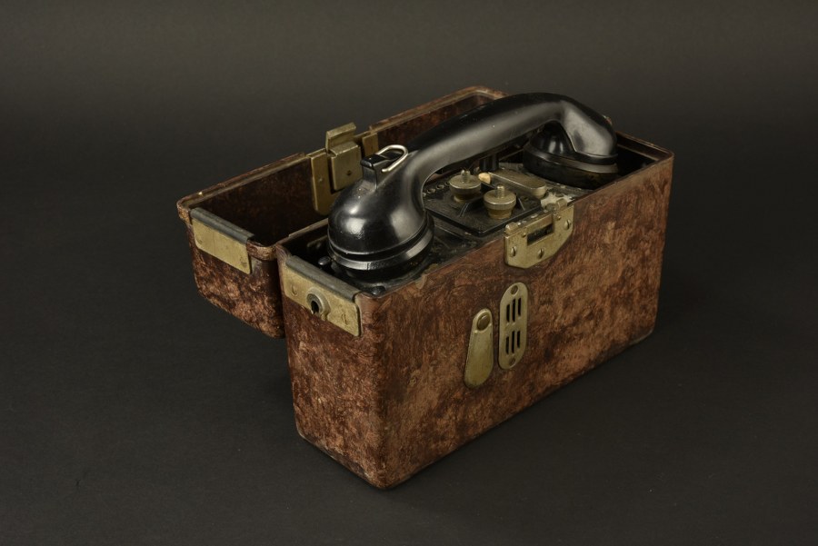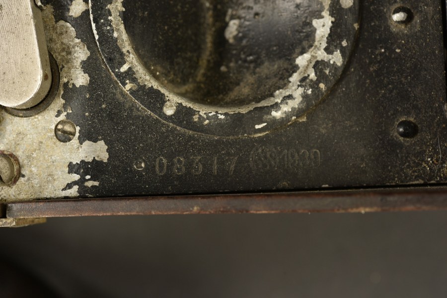 Téléphone de campagne. En bakélite, fortement usé. Manivelle présente. Combiné présent, câble manquant. Daté 1939. Pile manquante. A noter une certaine usure et patine de la pièce. Etat II+. Plus de photos sur WWW.AIOLFI.COM, more photos on WWW.AIOLFI.COM.