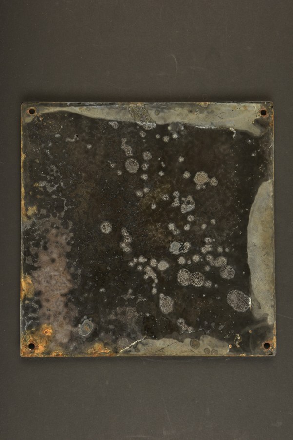 Plaque Deutsche Reichslotterie. En métal émaillé blanc. Bombée. Inscription en noir Deutsche Reichslotterie. Trèfle à quatre feuilles présent. Quatre points de fixation. Dos de la pièce de couleur noire. Pièce sans garantie d'origine. Quelques manques dans l'émail. A noter une certaine usure et oxydation de la pièce. Dimensions 25 x 25 cm. Etat II+. Plus de photos sur WWW.AIOLFI.COM, more photos on WWW.AIOLFI.COM.