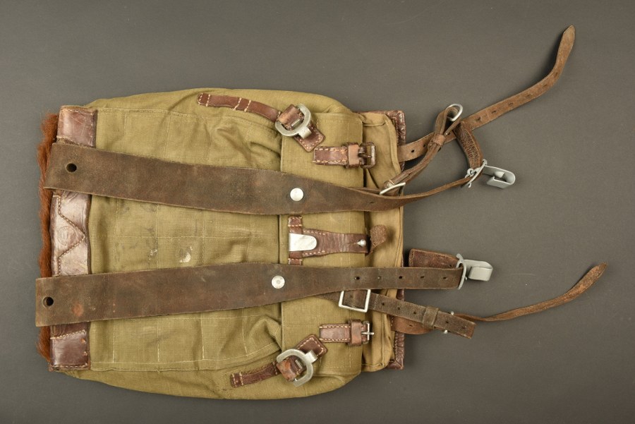 Sac à dos poils de vache. En forte toile coton Feldgrau. Poils de vache brune. Toutes les sangles sont présentes, ainsi que toutes les pièces métalliques. Les bretelles sont complètes. Daté 1937. A noter une certaine usure et patine de la pièce. Etat II+. Plus de photos sur WWW.AIOLFI.COM, more photos on WWW.AIOLFI.COM.