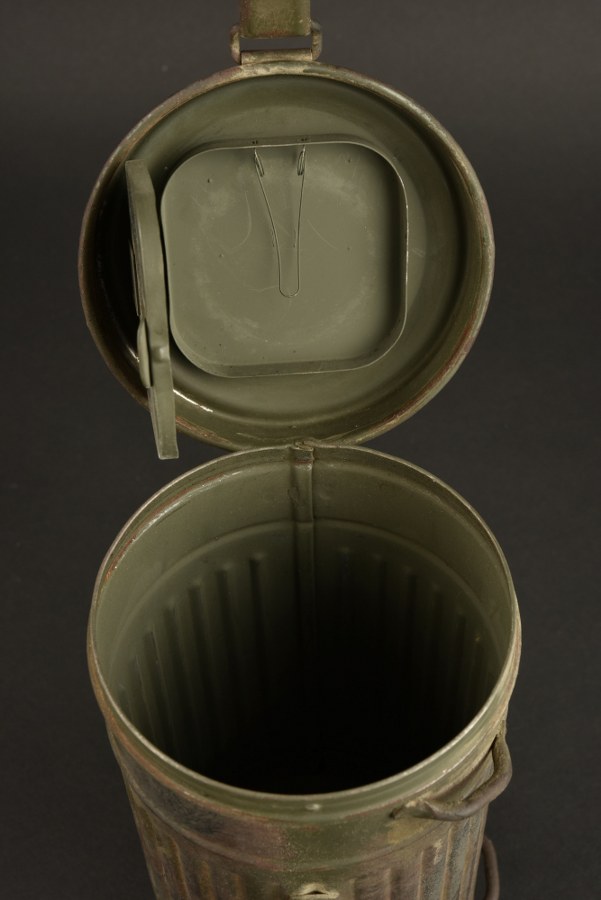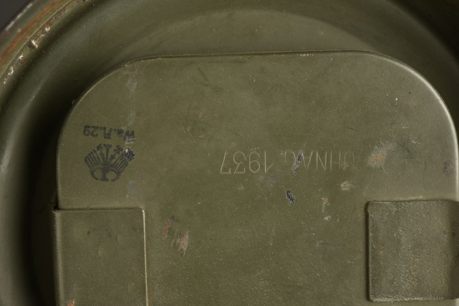 Boitier de masque anti-gaz camouflé. Modèle court en métal. Peinture camouflé ocre et vert à 50%. Tirette complète. Les sangles sont absentes . Reste de numéro 3018. Verre de rechange manquant. Selon les informations du vendeur, cette pièce provient de Normandie. A noter une certaine usure et patine de la pièce. Etat II+. Plus de photos sur WWW.AIOLFI.COM, more photos on WWW.AIOLFI.COM.