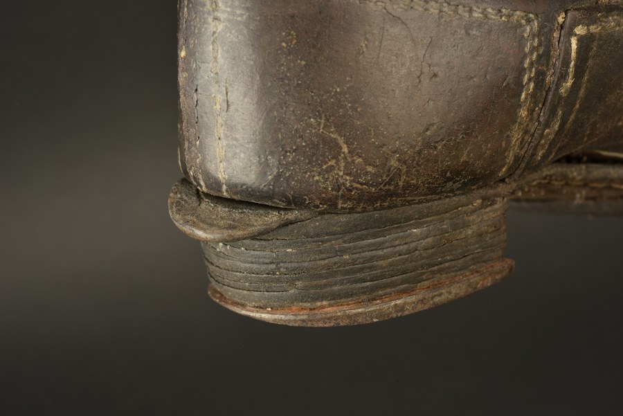 Bottes de cavalerie allemande. Tiges hautes, en cuir marron. Paire homogène. Sans marquages visibles. Talons ferrés. Tous les clous ont été enlevés. Approximativement une pointure 40/41 française. A noter une certaine usure et patine des pièces. Etat II+. Plus de photos sur WWW.AIOLFI.COM, more photos on WWW.AIOLFI.COM.