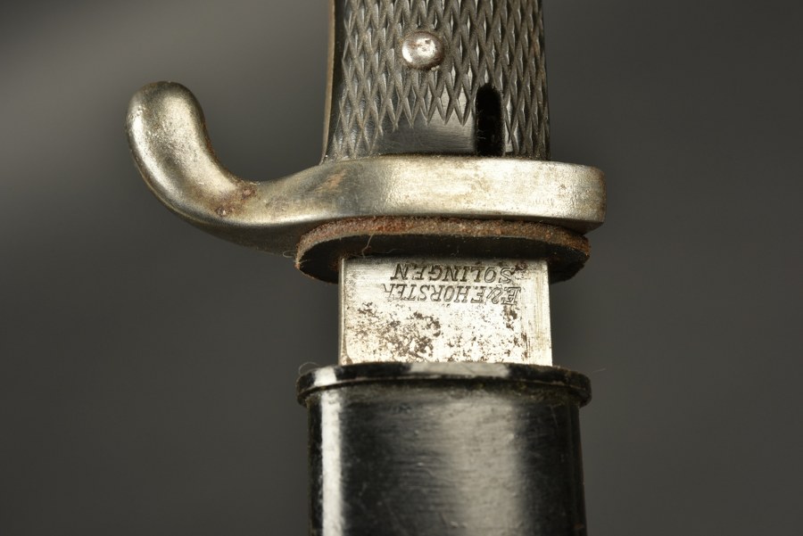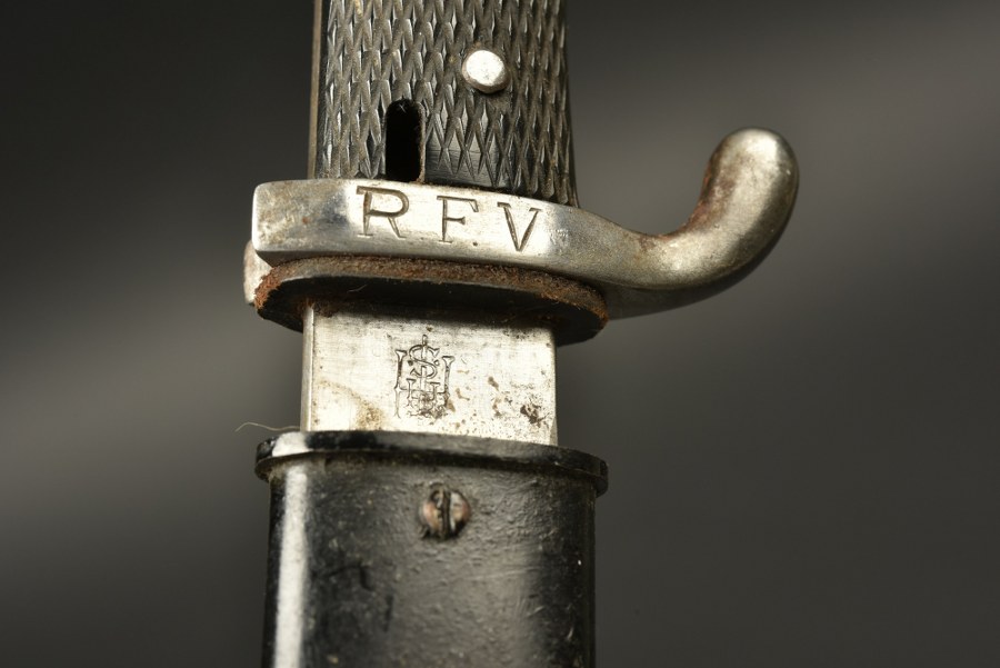 Baïonnette de convoyeur de fond. Plaquettes en bakélite noir. Toutes les garnitures métalliques sont en bon état. Bouton poussoir fonctionnel. Garde marquée RFV. Lame partiellement oxydée. Fabrication E&F Hörster Solingen. Fourreau en métal, peinture noire à 90%. A noter une certaine usure et patine de la pièce. Etat II+. Plus de photos sur WWW.AIOLFI.COM, more photos on WWW.AIOLFI.COM.