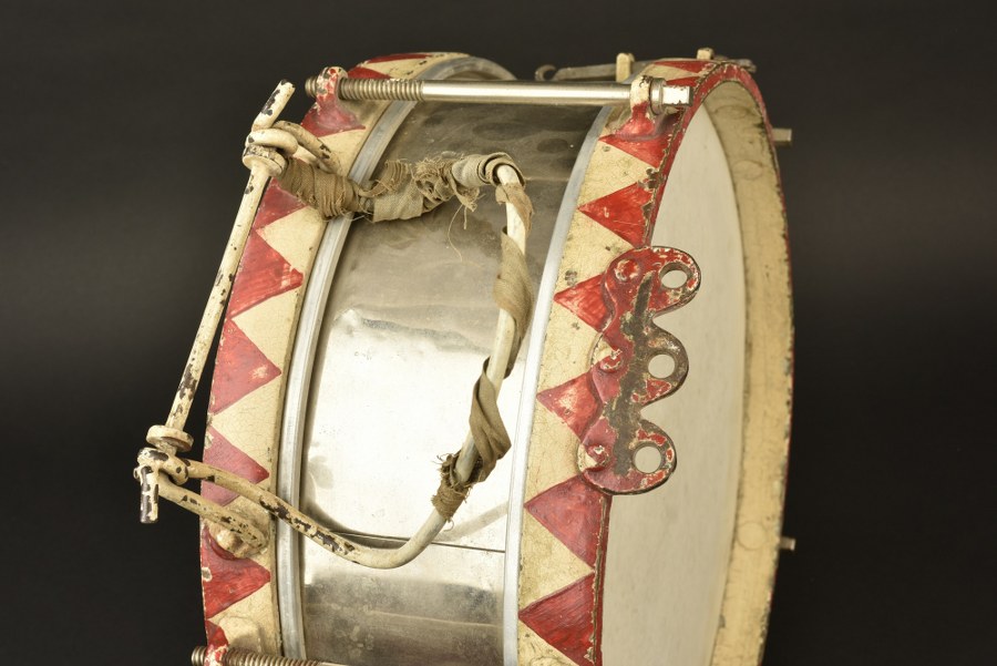 Tambour HJ. En bois et métal. Peinture rouge et blanche à 70%. Poignée de transport présente. Les peaux sont postérieures. A noter une certaine usure et patine de la pièce. Etat II. Plus de photos sur WWW.AIOLFI.COM, more photos on WWW.AIOLFI.COM.