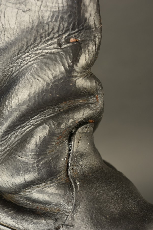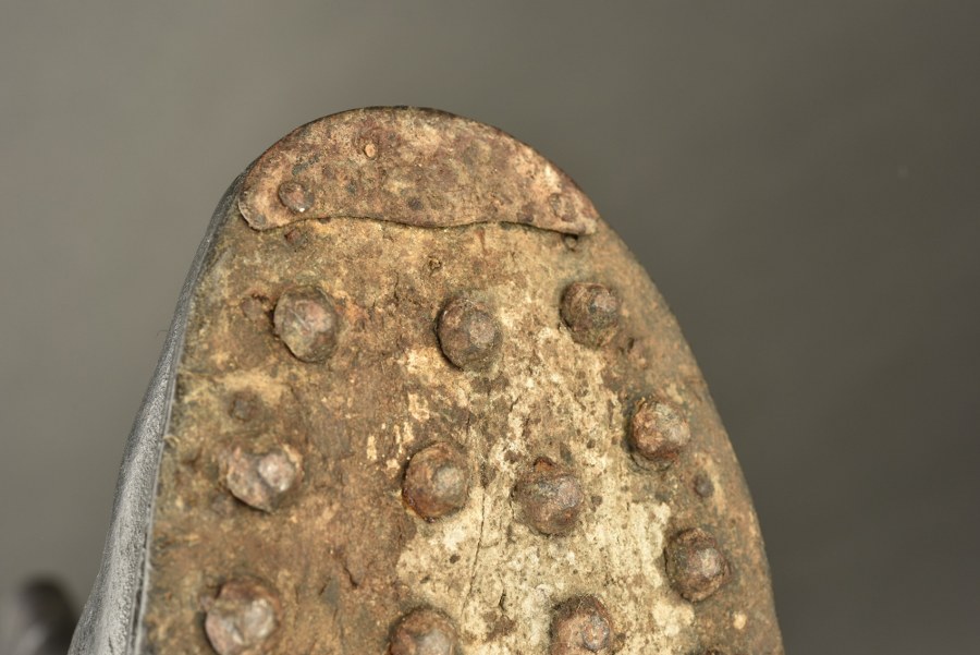 Bottes troupes. Paire homogène en cuir noir. Certaines coutures sont défaites, et le cuir est recollé. Paire homogène. Cuir relativement souple. Semelles cloutées et talons ferrés. Approximativement une pointure 43/44 française. Sans marquages visibles. A noter une certaine usure et patine de la pièce. Etat II+. Plus de photos sur WWW.AIOLFI.COM, more photos on WWW.AIOLFI.COM.