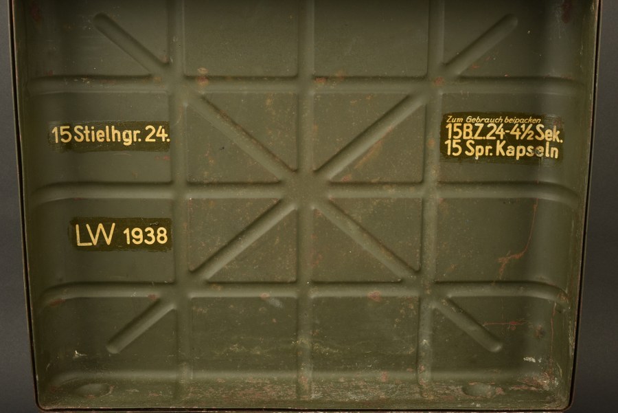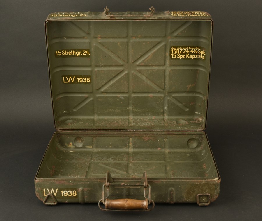 Caisse sanitaire allemande. Caisse de grenade à manche, en métal, peinture Feldgrau à 60%. Croix rouge dans un cercle blanc, peintes sur les deux faces de la caisse. Un côté est beaucoup plus usé que l'autre. Poignée en bois, système de fermeture complet. Marquages 15 Stielhgr 24 LW 1938 et zum gebrauch beipacken 15 BZ 24-4 1/2. Rack interne manquant. Reste de marquages visibles à l'intérieur. L'authenticité des croix rouge n'est pas garantie. A noter une certaine usure et oxydation de la pièce. Etat II+. Plus de photos sur WWW.AIOLFI.COM, more photos on WWW.AIOLFI.COM.
