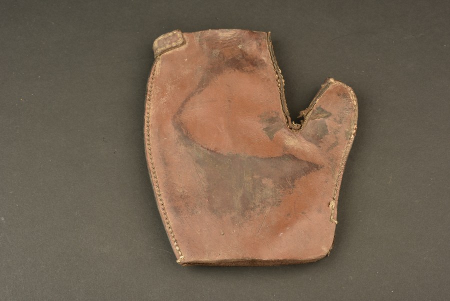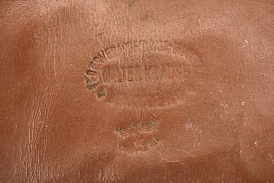 Gant d'artilleur provenant de Tournai sur Dive. En cuir marron, certaines coutures sont défaites. Fabrication Walter Krause, aigle WAA présent. A noter une certaine usure et patine de la pièce, ainsi que des tâches et accrocs. Selon les informations du vendeur ce gant provient de Tournai sur Dive. Etat II+. Plus de photos sur WWW.AIOLFI.COM, more photos on WWW.AIOLFI.COM.